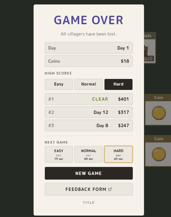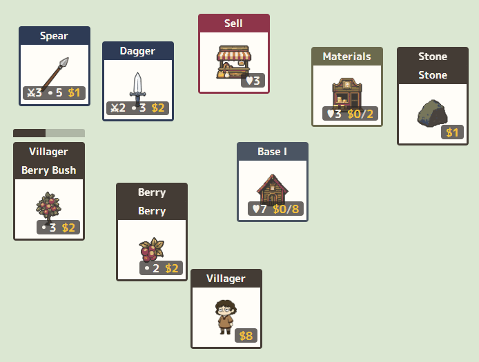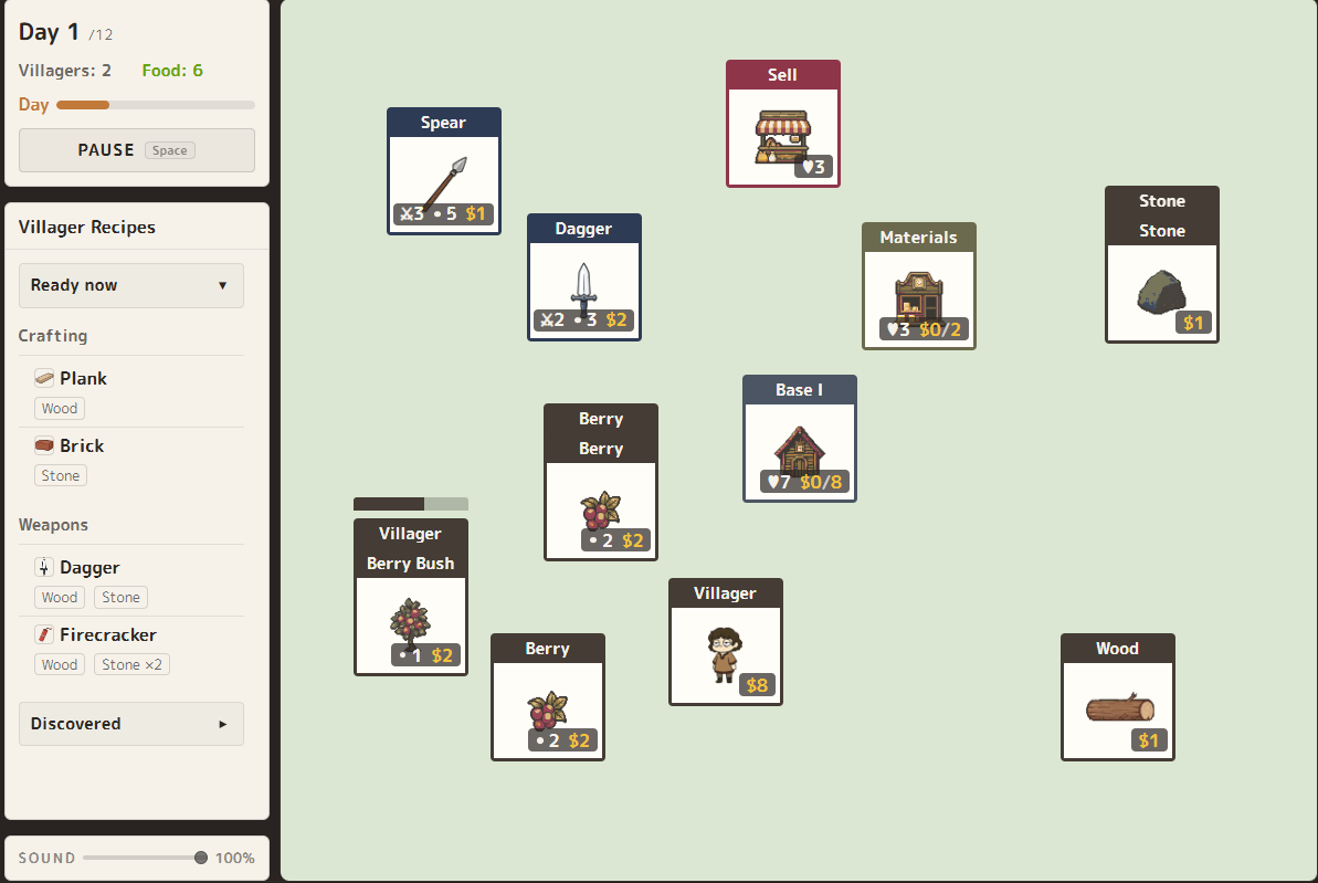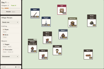 You drag and stack cards to build an economy, craft tools and weapons, and keep your village alive through 12 day/night cycles.