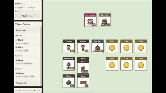 Build by day, survive the night. Drag and stack cards to craft tools and weapons, and keep your village alive through 12 day/night cycles.